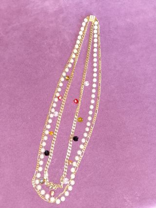 Elegante collar de varias cadenas doradas adornado con perlas y cristales de colores. - Diseño multicapa. - Cierre de mosquetón. - Perlas de imitación blancas. - Cristales de colores variados (rojo, amarillo, negro, transparente).