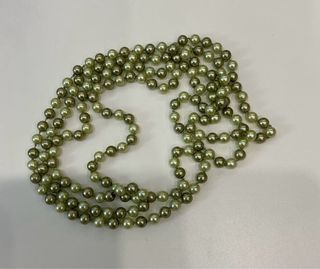 Elegante collar largo de perlas sintéticas. - Diseño de doble hebra. - Perlas de tono verde y verde oliva.