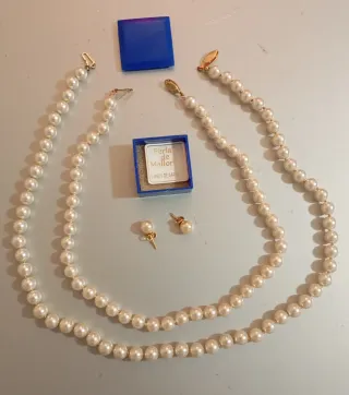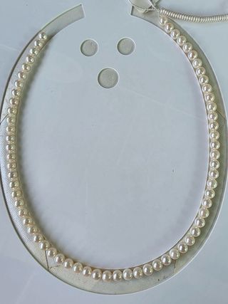 Collar de perlas Akoya 6–6,5 mm · 40–43 cm (16–17”) Descripción: Collar de perlas cultivadas tipo Akoya (según etiqueta). Tamaño 6–6,5 mm, redondas y con buen lustre. Largo aprox. 40–43 cm. Se vende tal cual fotos.