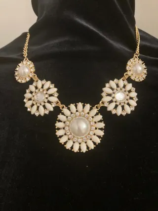Elegante collar estilo Chanel vintage, con un diseño floral y detalles brillantes. - Diseño floral con perlas y cristales. - Cadena dorada. - Pieza central grande con perla.