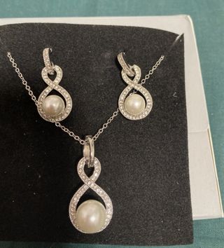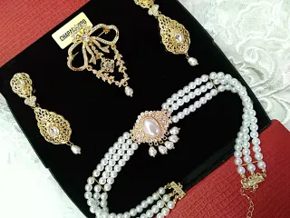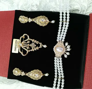 Collar pendientes y joia. Perlas y cristales. Modelo de adulta.