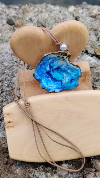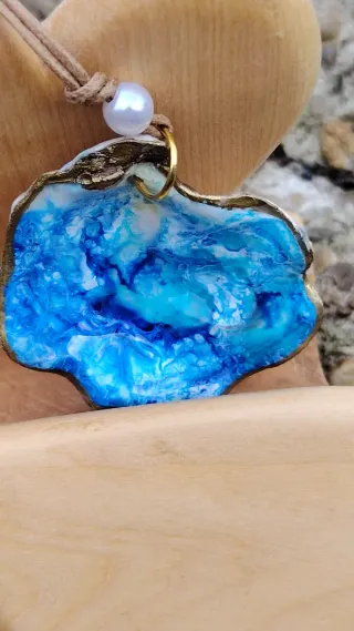 Collar artesanal con una concha marina decorada y una perla. - Concha con diseño en tonos azules y blancos. - Borde dorado. - Cierre con cordón ajustable.