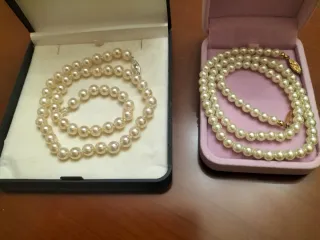 Conjunto de dos collares de perlas de la marca Bannao. - Un collar se encuentra en su caja original. - El otro collar está en una caja de terciopelo rosa.
