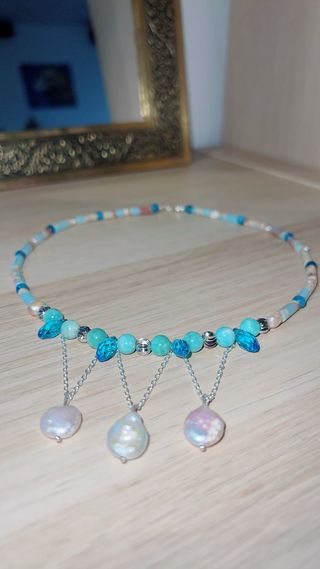 Elegante collar artesanal con piedras (apatita,amazonita,turquesa)y perlas naturales. los detalles de metal son de plata y acero inoxidable. - Diseño único con cuentas en tonos azules y rosados. - Colgantes de perlas barrocas. - Cierre de plata.