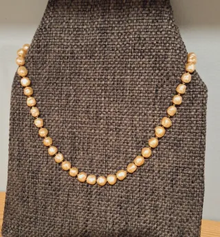 Elegante collar de perlas con un bonito acabado. Perlas con tono beige/dorado. Detalles del cierre en tono dorado con incrustaciones.