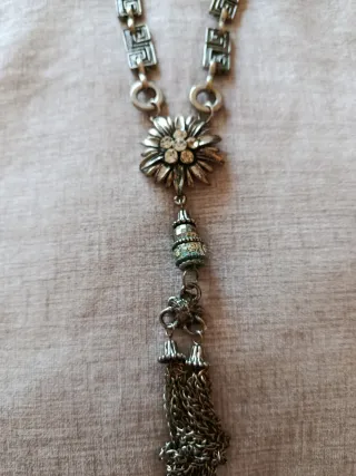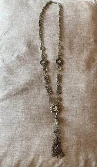 Elegante collar largo con un diseño detallado. - Cadena con eslabones y detalles geométricos. - Colgante central en forma de flor con pequeñas perlas. - Adorno adicional con borla de cadena.