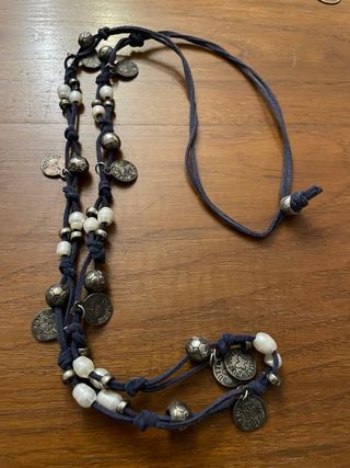Collar largo con cordón azul y adornos. - Cuentas de perlas blancas. - Dijes de monedas plateadas. - Cuentas metálicas con diseño de balón.