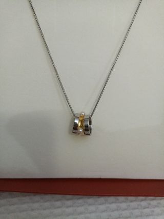 Colgante con cadena de 37/42cm en acero rodiado y dorado. La cadena lleva incluida 3 aros en plata y plata dorada con perlas blancas de 3mm. como toque de distinción de la Perla de Majorica. Hecho en nuestra fábrica de Mallorca 10 años de garantía Perla Diametro: 3 Mm Color: Blanco Forma: Redonda Collar Material: Acero