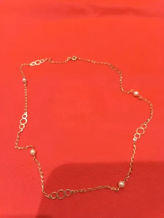 Elegante collar de oro de 18 quilates adornado con perlas naturales. - Perlas pequeñas y luminosas. - Diseño delicado con eslabones y perlas. - Mide 40 cm y pesa 2,20 gramos. Mirar bien la medida, es para cuellos finos. Resto de tienda cerrada por jubilación nuevo sin estrenar. No atiendo regateo. Lo puedo entregar en Segovia Ávila o Madrid o enviar a casa.