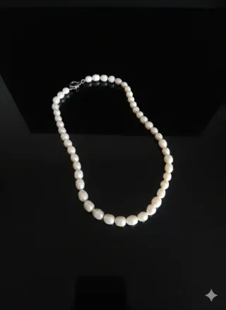 Elegante collar de perlas con un cierre de plata. Este collar es una pieza de bisutería de perlas cultivadas de agua dulce, comúnmente caracterizadas por sus formas irregulares y texturas naturales. No tengo caja