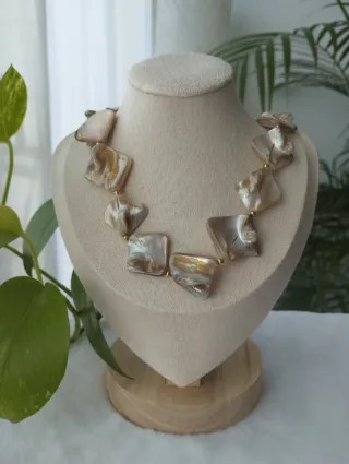 Preciosa gargantilla de estilo marino. Está compuesta por piezas cuadradas de concha en tonos beige y dorado, con detalles brillantes. Incluye un colgante con estrella de mar dorada y perla. Es una pieza única y elegante, ideal para añadir un toque de estilo a tu look. - Collar de conchas naturales. - Diseño cuadrado. - Elegante colgante. -Acero inoxidable.