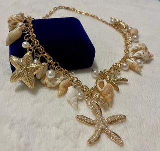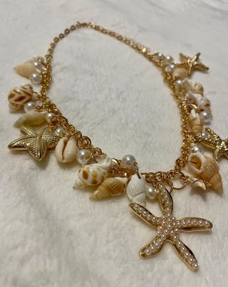 Este encantador collar te transportará a la orilla del mar con su diseño inspirado en la playa. Presenta una cadena dorada adornada con delicadas conchas marinas, elegantes estrellas de mar y perlas iridiscentes que añaden un toque de sofisticación. Combina elementos marinos como conchas y estrellas de mar con el brillo de las perlas y el color oro. Ideal para looks casuales de verano, eventos playeros o para añadir un toque bohemio a tu estilo diario Tiene un desperfecto como se muestra en la foto en una de las conchas al ser naturales no son perfectas Envío rapido Caja no incluida se negocia aparte Solo envio Metal plástico