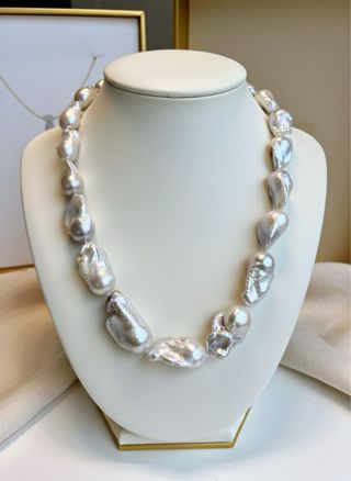 Haz una declaración de estilo con este impresionante y exclusivo collar! Esta pieza es una joya verdaderamente única, ensamblada a mano, que destaca por sus perlas barrocas naturales de gran tamaño. Su forma irregular y su lustre iridiscente (con tonos que varían entre el gris plateado y el lavanda) hacen que cada perla sea diferente, garantizando que nadie más llevará una pieza exactamente igual. ✨ Detalles del Producto: • Tipo de Perla: Barroca (Baroque). Son perlas cultivadas con formas irregulares y orgánicas, muy buscadas por su carácter moderno y único. • Color: Gris blanco /Lavanda iridiscente. • Tallas de las Perlas: Desde