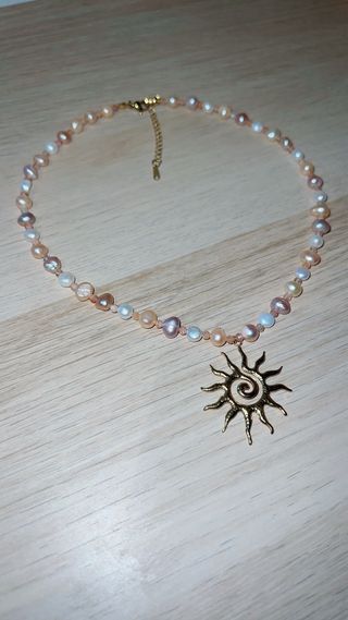 Collar delicado con perlas y un colgante de sol y también la piedra natural llamada piedra del Sol. - Perlas de colores variados. - Colgante con diseño de espiral solar. - Cierre y cadena de extensión en acero inoxidable dorado.