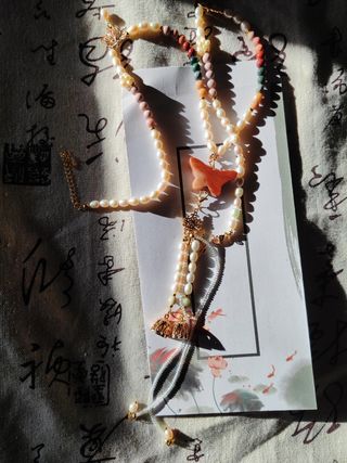 Perlas naturales,jade xiu,jade hetian Hecho a mano,sin usar Collar de hanfu,yingluo 岫玉汉服璎珞,淡水珍珠,和田玉扇子,白玉髓珠子