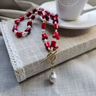 Collar Coral Rojo y Perlas Naturales con colgante