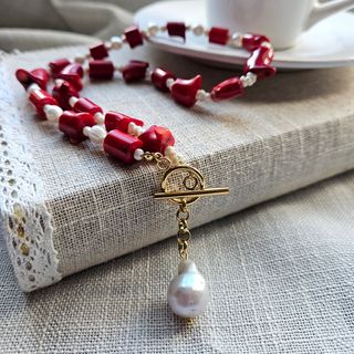 Collar de inspiración marina con perlas de agua dulce, coral rojo de bamboo auténtico, cierre dorado tipo barra y aro, y colgante de perla barroca. Las variaciones naturales hacen cada pieza única. Medida collar: 45 cm