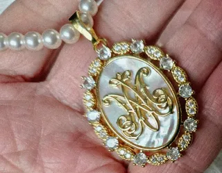 Collar y medalla con el símbolo Avemaría en nácar natural chapado en oro de 18 kilates y perlas Precioso y muy elegante Para fallera A estrenar
