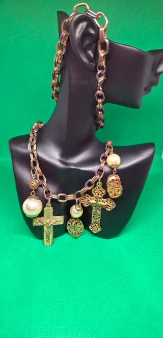 Collar vintage con dijes cruz y perlas