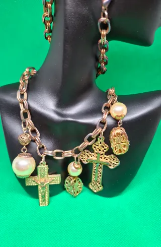 Elegante collar vintage en dorado viejo con una cadena de eslabones gruesos y varios dijes colgantes. Dijes de cruces doradas. Perlas de imitación. Un dije con forma de esfera calada. -Cadena de eslabones dorados y cobrizos. Usado hace muchos años una vez para una cena de Fin de Año