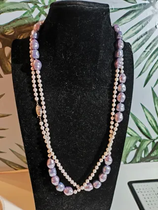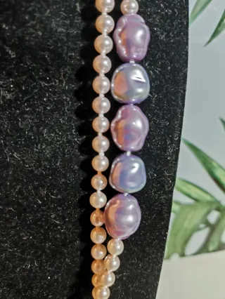 Elegante collar vintage de perlas en dos hileras. Combina perlas de mayor tamaño en tono lavanda con perlas más pequeñas en blanco. El cierre es plateado. - Diseño de doble cadena. - Perlas de estilo barroco y redondas.