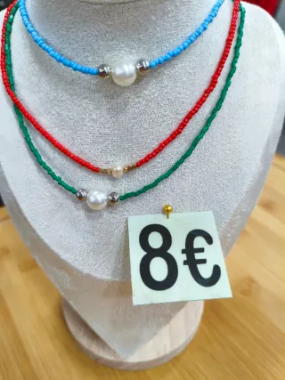 Conjunto de tres collares, cada uno con un diseño único. - Collar con cuentas blancas y negras. - Collar con cuentas rojas y transparentes. - Collar con perlas y cuentas rosadas. 2 euros cada uno