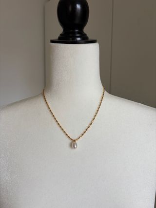 Elegante collar con una perla colgante. Acero inoxidable - Cadena fina de color dorado. - Perla de forma ovalada.