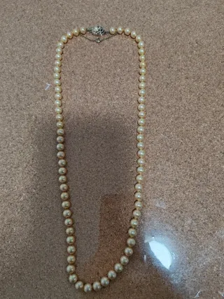 Elegante collar de perlas cultivadas de dos vueltas, con un estilo inspirado en la década de 1920. El cierre es un detalle de pedrería. - Perlas de color beige. - Cierre plateado con pedrería. Las perlas tienen un color dorado/amarillo cálido,a que que son perlas naturales o cultivadas de los Mares del Sur. -Cierre: El broche es una pieza central destacada con un diseño de racimo de flores. Le faltan piedras. -Se salta la pintura de la perlas. -Tacto frío, no son imitación.
