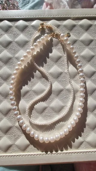 Elegante conjunto de bisutería con dos collares de perlas. - Collar principal con perlas de mayor tamaño. - Collar secundario con perlas más pequeñas. - Cierres y detalles en bisutería dorada.