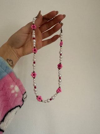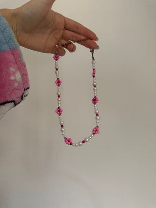 Collar hecho a mano con un diseño encantador de flores y perlas. - Cuentas de perlas blancas. - Adornos en forma de flor color rosa. - Cierre de cadena metálica.