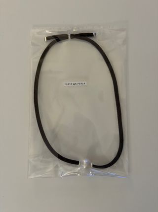 Elegante collar corto de la marca Uno de 50. Medidas 43 cm. Tiene una extensión de 4cm que sé pueden sacar - Diseño con cordón negro. - Detalle central de perla. - Cierre y cadena de ajuste en plata.