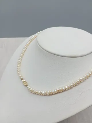 Nuevo. Perlas de 5mm y cierre de oro. Incluye todos los elementos originales: el collar, la caja, la bolsa de cartón, la bolsita de terciopelo, la garantía la toallita de tela y la tarjeta.