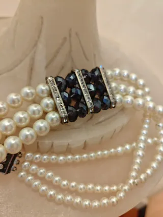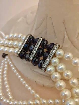Elegante collar de estilo clásico/retro, ideal para eventos, bodas o para dar un toque sofisticado a un look diario. Diseño: Tres hileras de perlas de imitación en color crema/marfil con degradado de tamaño hacia el cierre. Detalle central: Pieza de bisutería con cristales facetados en color negro/ahumado y tiras de strass brillantes que aportan mucho cuerpo y presencia. Cierre: Cierre de caja plateada con detalles de cristal, muy segura y fácil de poner. Estado: Bien conservado (ver fotos para detalles de las perlas). Estilo: Perfecto para looks tipo Chanel, años 50 o estética "Old Money".