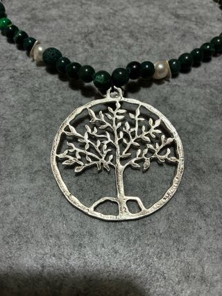 Elegante collar con un diseño de árbol de la vida. - Cuentas de color verde y perlas. - Colgante de plata con detalle de árbol. - Cierre de mosquetón.