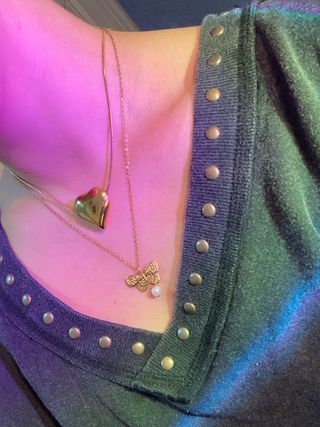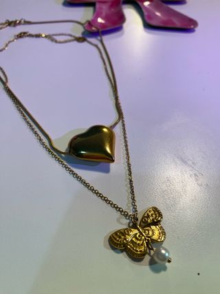 Elegante collar de dos cadenas con un corazón y una mariposa. - Colgante de corazón liso. - Colgante de mariposa con perla. - Cadena fina y delicada.