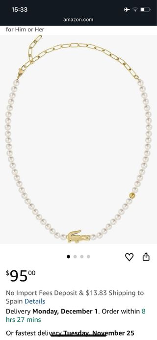 Elegante collar de perlas con un detalle de cocodrilo dorado de Lacoste. Un accesorio llamativo y sofisticado. - Cadena de eslabones dorados. - Perlas blancas. - Colgante de cocodrilo dorado.