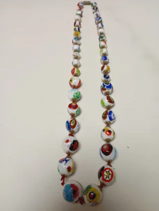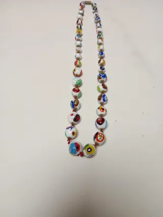 Elegante collar con perlas de cristal de Murano, cada una con un diseño único y vibrante. 38 perlas. 27×2 cm - Perlas de cristal de Murano. - Diseño multicolor con detalles intrincados. - Cierre seguro.