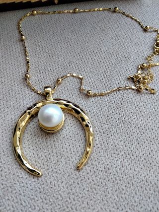 incluye cadena y colgante con forma de media luna con perla de agua dulce. La cadena mide 45 cm y un alargador de 5 cm.
