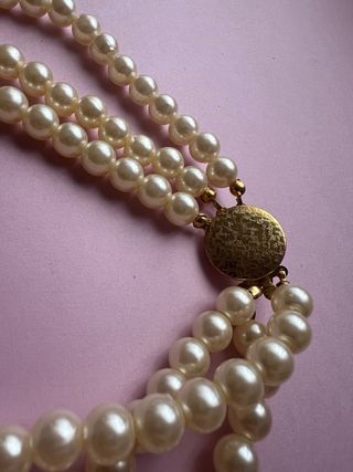 Elegante collar de perlas sintéticas con tres vueltas. Un accesorio clásico que añade un toque de sofisticación a cualquier atuendo. - Diseño de tres hileras. - Perlas de acabado brillante.