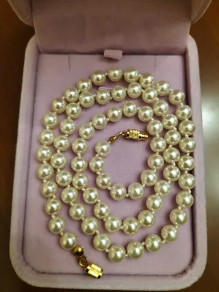 Elegante conjunto de collar de perlas, con más de 25 años de antigüedad. - Perlas de color beige dorado. - Cierre de seguridad.