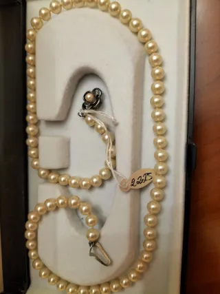 Elegante collar de perlas con cierre. - Perlas de color blanco nacarado. - Cierre metálico con detalles. - Diseño clásico y atemporal.