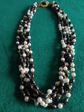Elegante collar vintage de varias vueltas, con un diseño único y sofisticado. Ideal para añadir un toque de distinción a cualquier atuendo. - Combinación de perlas y ônix. - Cierre dorado con detalle. - Sin usar, en perfecto estado.