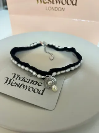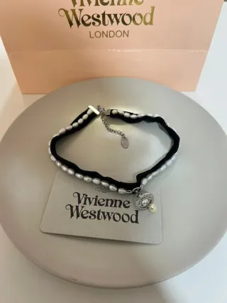 Elegante collar de la marca Vivienne Westwood. - Base de terciopelo negro. - Detalle de perlas blancas. - Cierre de cadena ajustable.