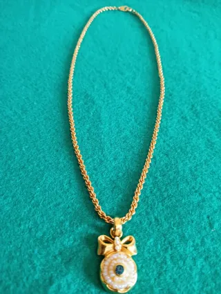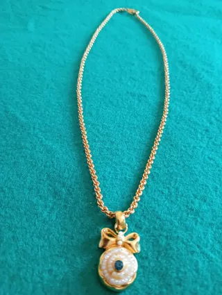 Elegante collar vintage con cadena de acero y colgante. - Diseño de lazo con detalles de perlas y una piedra azul central. - Acabado en tono dorado.