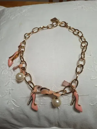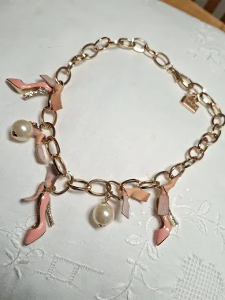 Collar con cadena dorada y varios dijes colgantes. Un accesorio llamativo y divertido. - Dijes de zapatoss rosas con tacones brillantes. - Perlas de imitación. - Lazos de cuero rosa decorativos. En el mosqueton de cierre, bolso con marca B&P, perlita y chapita marca Muy coqueto