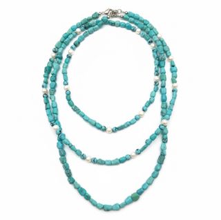 Elegante conjunto de collares con cuentas de turquesas barrocas y perlas blancas. - Diseño de múltiples vueltas. - Cuentas de turquesa de forma irregular. - Perlas intercaladas a lo largo de las cadenas.