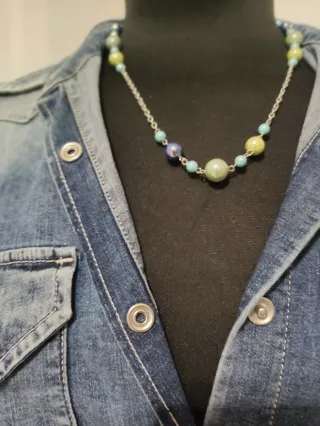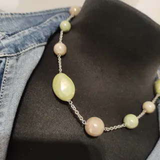 Elegante collar con perlas de Mallorca. Un accesorio que aporta un toque de color y sofisticación a cualquier atuendo. - Diseño con perlas de diferentes tamaños. - Combinación de tonos beige y verde.