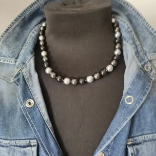 Elegante collar de perlas de Mallorca. Un accesorio que aporta un toque de distinción. - Diseño con perlas intercaladas. - Acabado brillante. Negro, gris y plata. Perlas de 8mm.