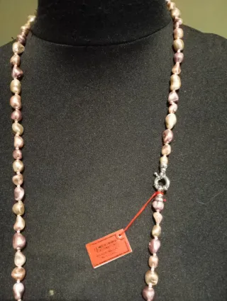 Elegante collar largo con perlas auténticas de Mallorca. Un accesorio clásico que aporta un toque de distinción. - Perlas de rio de forma irregular. - Combinación de tonos beige y rosados.