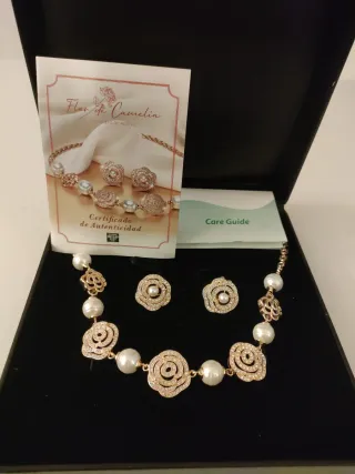 Elegante conjunto de collar y pendientes con diseño de flor y perlas. - Diseño floral detallado con circonitas. - Perlas de agua dulce. - Acabado en tono dorado.
